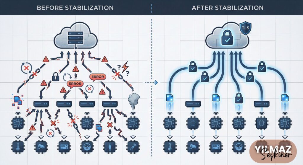 IoT sistemlerde veri akışının durması çoğu zaman uygulama yazılımından değil, DNS ve TLS yapılandırmasındaki küçük ama kritik eksiklerden kaynaklanır.